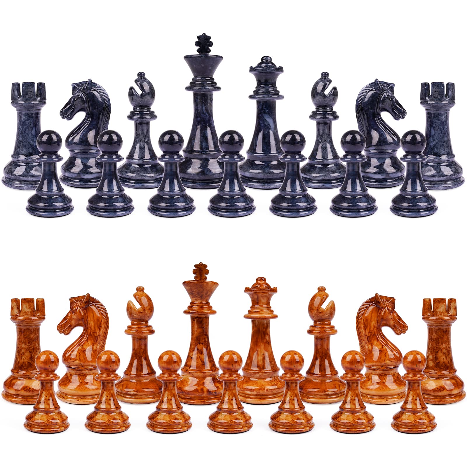 - Material and Quality: Pieces are made of Acrylic+Metal with a bronze and marbled finish ,smooth hand feel and durable.To help add to your convenience, we designed the chess pieces with felted bottoms which help to prevent the chess board from being scratched or damaged and also make them quieter and smoother to move. Moreover, this chess game can also be a fun way to you and stimulate their intelligence