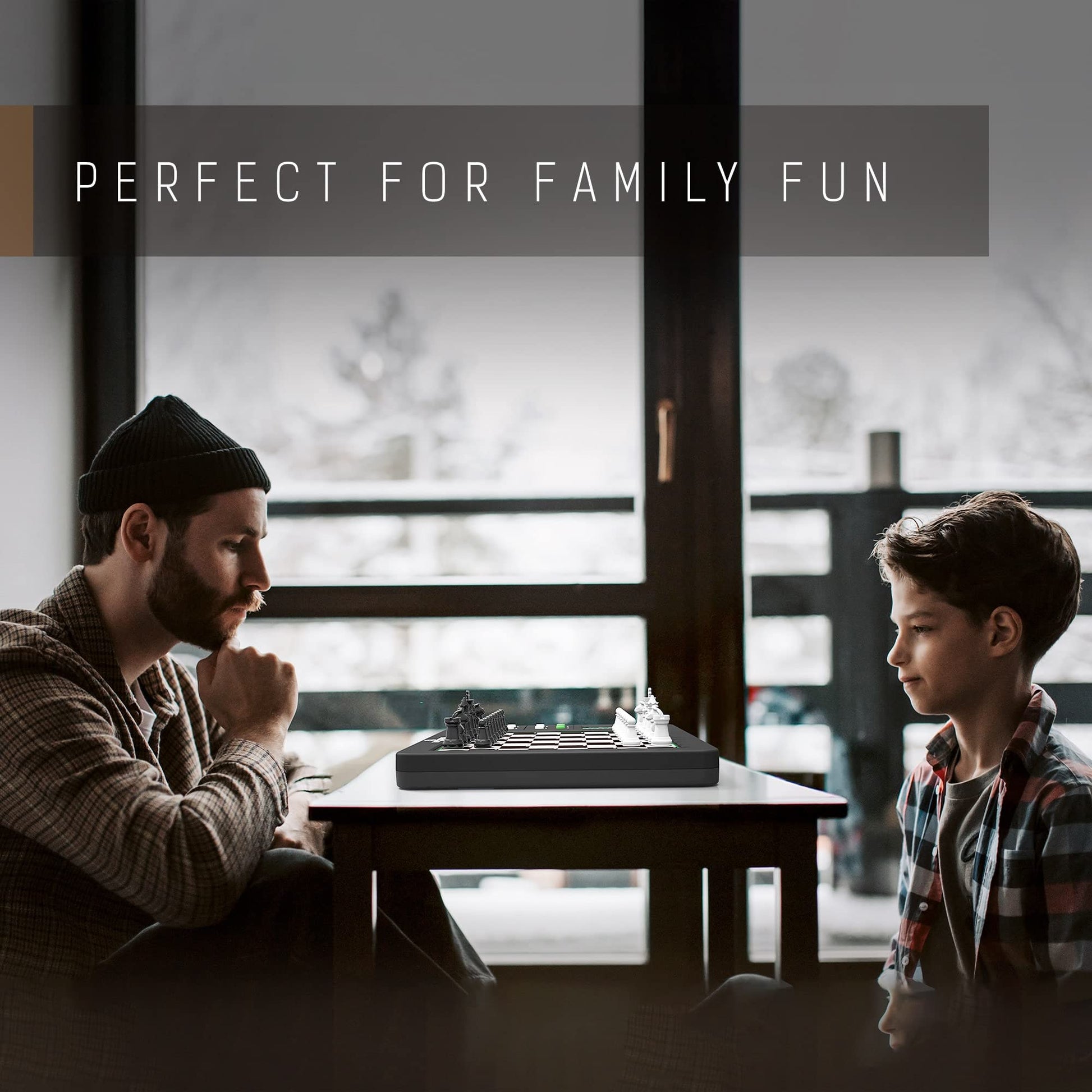 - All-in-one chess set for everyone: The QS200 Chess Game Set has everything you need to play chess, including an electronic chess board, 2 card chessboards, 32 magnetic chess pieces, and 18 instructional chess cards. It's great for both beginners and advanced players of all ages.